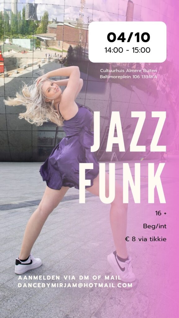 Op zaterdag 4 oktober van 14:00 tot 15:00 geeft Mirjam een energieke Jazz Funk pop-up les in Cultuurhuis Almere Buiten. Deze les is geschikt voor 16+ (beginner/intermediate niveau) en staat garant voor een uur vol groove en plezier.
