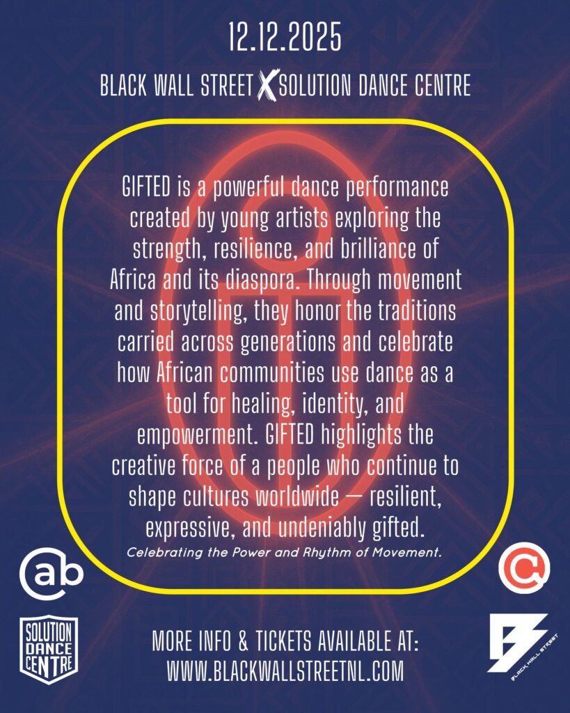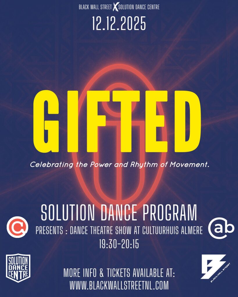GIFTED is een indrukwekkende dansvoorstelling van het Solution Dance Program Almere die de veerkracht, het erfgoed en de creativiteit van Afrikaanse en Afrikaanse diaspora-culturen eert. .Door middel van beweging, ritme en storytelling laat de voorstelling zien hoe dans geschiedenis meedraagt, identiteit vormt en gemeenschappen kracht geeft. Van voorouderlijke wortels tot moderne expressie: GIFTED belicht de schittering en kracht die nieuwe generaties blijven inspireren.